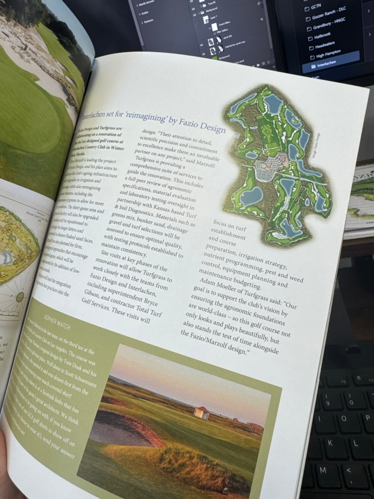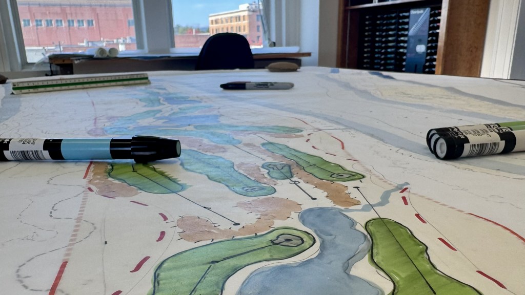 So for now, this is basically my life. I grind out a lot of work in AutoCAD, Photoshop, InDesign, and the Microsoft Suite, and I still spend a surprising amount of time drawing and coloring by hand. While the office can feel fairly quiet when senior associates are traveling, I never find a dull moment in my day. I’ve already had the opportunity to contribute to work on more than 100 golf courses—each one with its own challenges, constraints, and character.